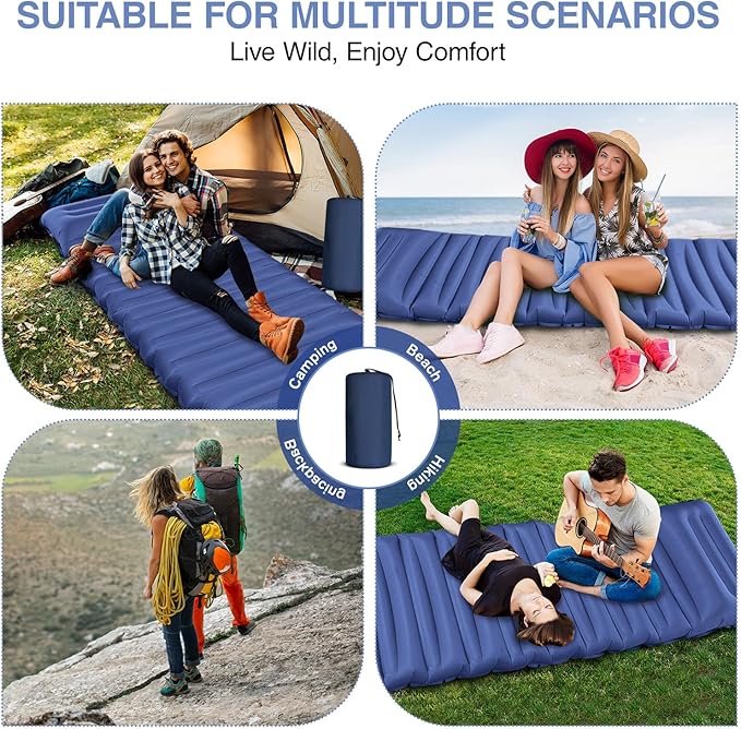 • 5” Extra Thick & Comfy Support: OUTTPLY sleeping pad measures 79 x 27 inches. After inflation, it is up to 5 inches thick, providing air support and keeping your body away from uneven ground and hard rocks. The upgraded tube-shaped design fits your hips and shoulders, allowing you to sleep comfortably in any sleeping position. Also, the built-in pillow makes your camping trip more convenient.