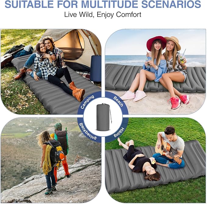 • 5” Extra Thick & Comfy Support: OUTTPLY sleeping pad measures 79 x 27 inches. After inflation, it is up to 5 inches thick, providing air support and keeping your body away from uneven ground and hard rocks. The upgraded tube-shaped design fits your hips and shoulders, allowing you to sleep comfortably in any sleeping position. Also, the built-in pillow makes your camping trip more convenient.