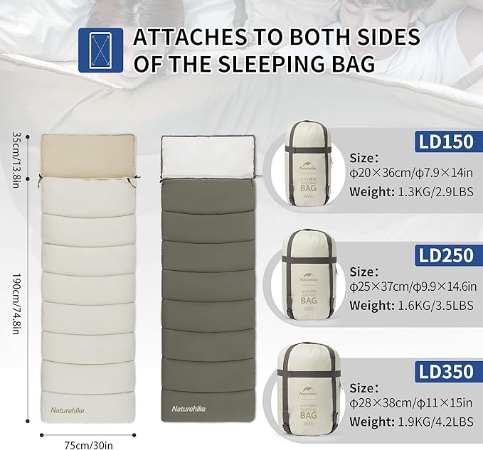 • [STAY WARM] Comfort temperatures are 12°C/ 53.6°F for the LD150 and 2°C/ 35.6°F for the LD350. The sleeping bag measures (74. 8+13.8) x 29.5 inches, allowing you to splice two sleeping bags together at the top and bottom to make a large double sleeping bag