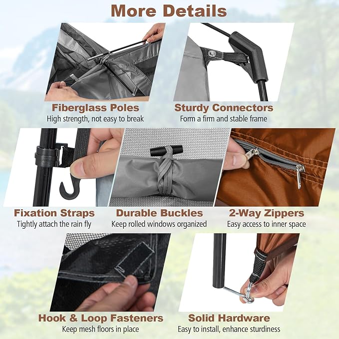• Heavy-Duty Construction for Stability: Reinforced with fiberglass poles and secured by 10 metal stakes + 4 wind ropes, this bathroom tent withstands moderate winds and rough terrain. The carefully selected Oxford fabric ensure durability, though it’s not recommended for extreme weather like heavy rain or snow.