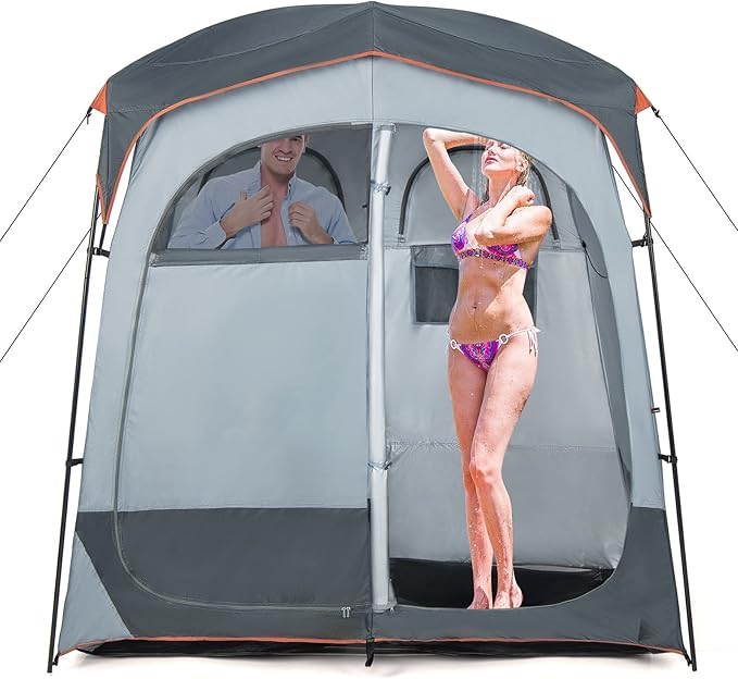 • Dual-Room for Privacy & Convenience: This oversized shower tent features two fully enclosed rooms (7' x 3.5' x 7'), separated by a zippered partition door, allowing simultaneous use for showering, changing, or storage. With ample space for two adults, it’s ideal for camping trips, beach days, or outdoor events where privacy and functionality are essential.
