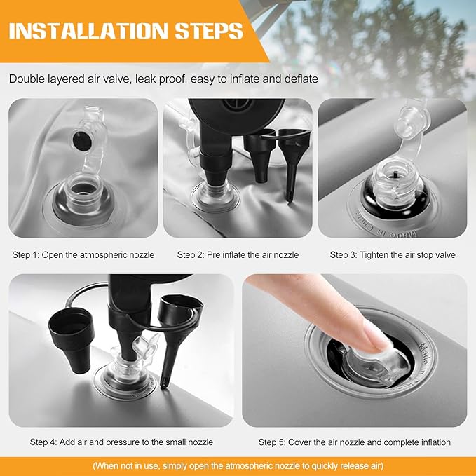 • 【Double-layer Inflatable Valve】Double-layer anti-leak nozzle, double-layer valve design ensures that gas can only enter but not flow out when inflating. It is equipped with an inflatable electric pump, accessories bag and repair bag.