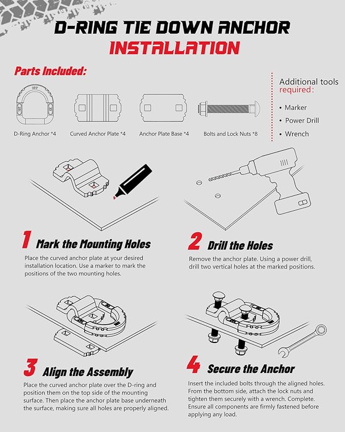 • EASY INSTALLATION-FULL HARDWARE INCLUDED: Comes with 8 bolts and lock nuts for mounting 4 D-rings (2 bolts per ring). No welding or drilling required on the d rings. Can be mounted on wood or metal surfaces with ease. Total load-bearing strength across 4 anchors is 40 tons