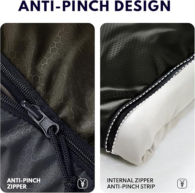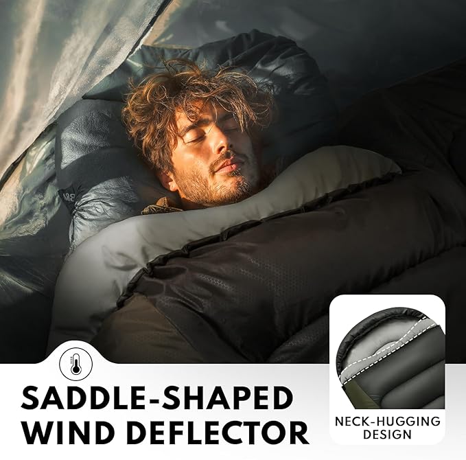 • 【LOTS OF SPACE TO WIGGLE AND PUT YOUR KNEES UP】You can unzip the feet separately to get some needed venting for additional comfort while still maintaining insulation. Two-way zipper with “zipper guard” to prevent stuck hooks effectively.The polar fleece area at the bottom of the sleeping bag is our carefully designed 'FOOT INSULATION AREA', which can provide better insulation effect.