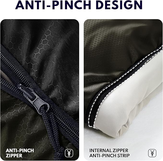 • 【LOTS OF SPACE TO WIGGLE AND PUT YOUR KNEES UP】You can unzip the feet separately to get some needed venting for additional comfort while still maintaining insulation. Two-way zipper with “zipper guard” to prevent stuck hooks effectively.The polar fleece area at the bottom of the sleeping bag is our carefully designed 'FOOT INSULATION AREA', which can provide better insulation effect.