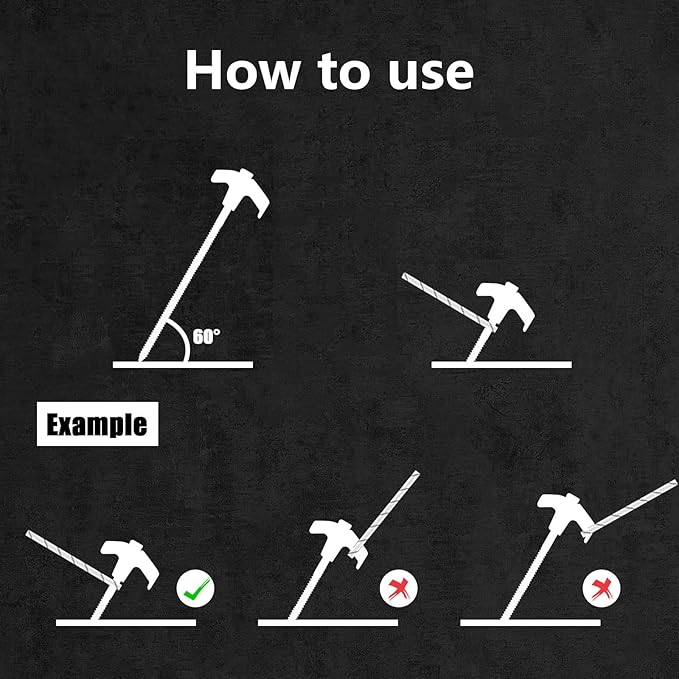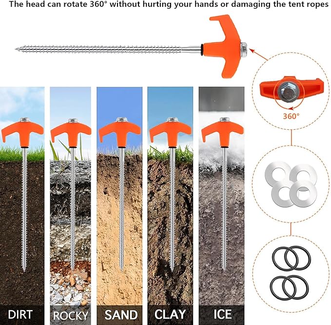• 【Simple Installation】These screw in tent stakes with pointed tips is easy to insert into the grass, dirt, hard soil, and gravel. The metal threaded tent spikes offer a stronger grip in windy conditions. With the help of a cordless drill or impact driver, ground anchors will make your tents, canopy, awning, tarps, and grasp the ground more stable and reliable.