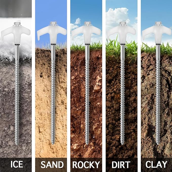 • 【Simple Installation】These screw in tent stakes with pointed tips is easy to insert into the grass, dirt, hard soil, and gravel. The metal threaded tent spikes offer a stronger grip in windy conditions. With the help of a cordless drill or impact driver, ground anchors will make your tents, canopy, awning, tarps, and grasp the ground more stable and reliable.