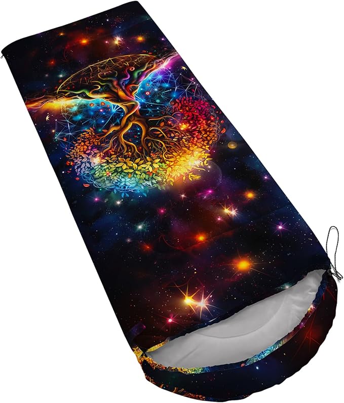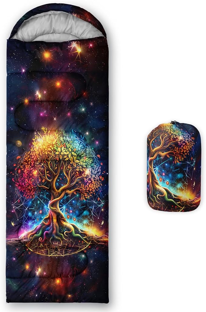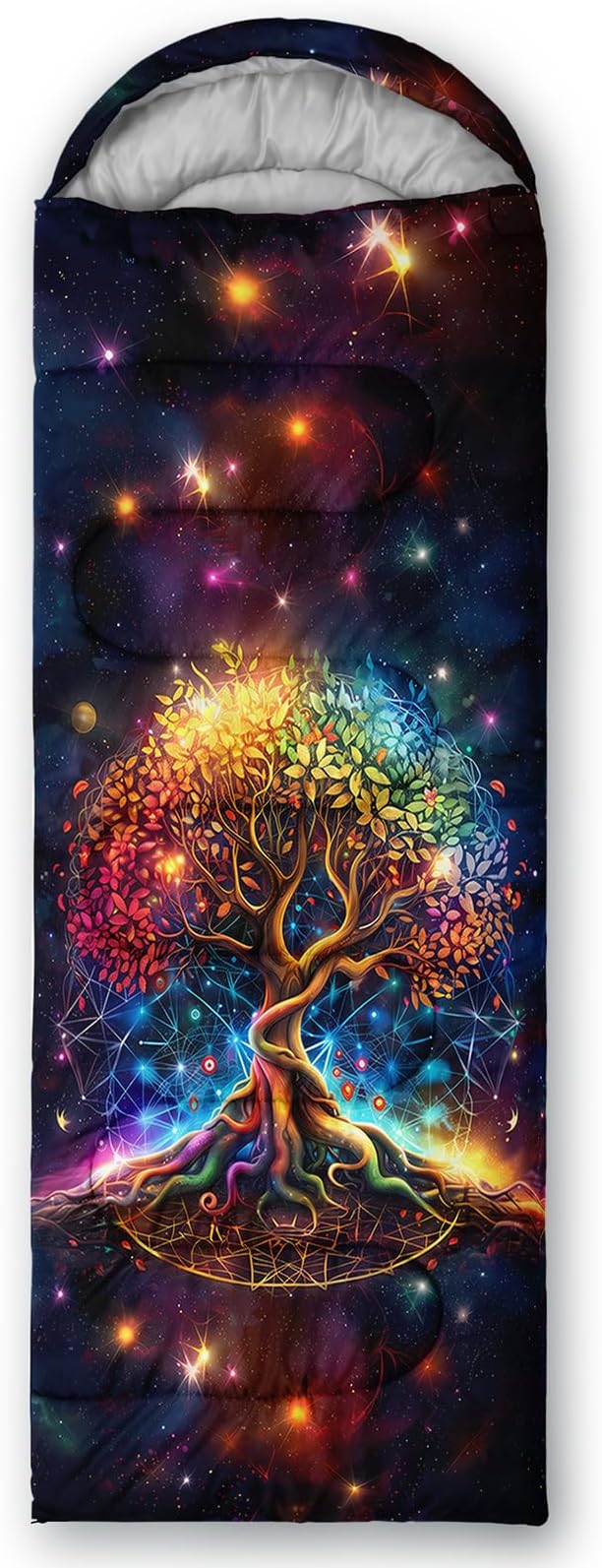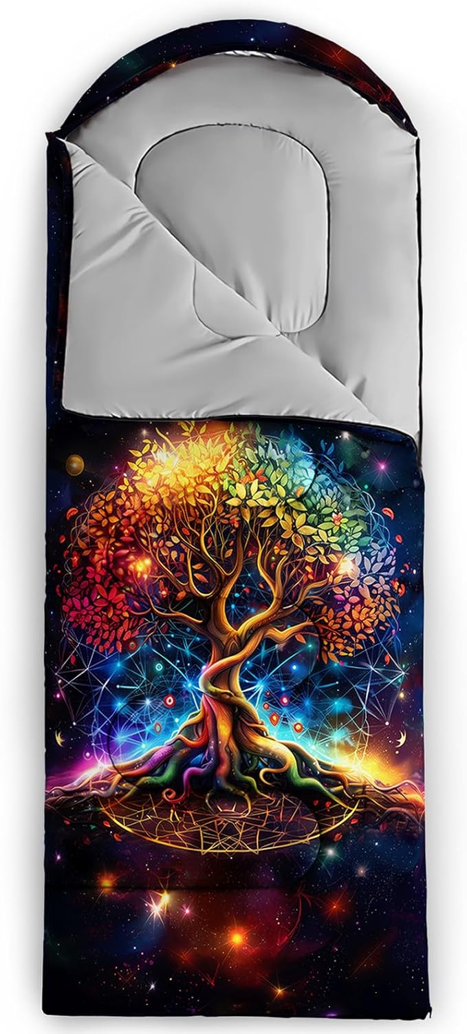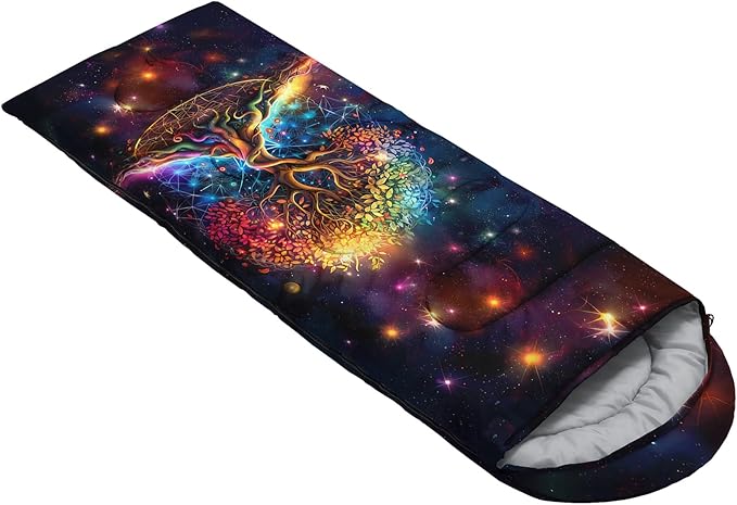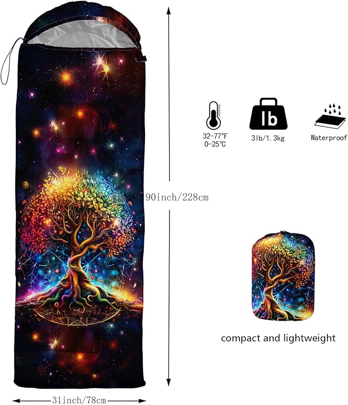• Unique Tree of Life Design:This Tree of Life pattern sleeping bag is made of 3D digital printing with vibrant colors and patterns,size: 31W x 90L inches,temperature range: 32℉-77℉ (0℃-25℃),it also also have a weather resistant waterproof design to keep you warm and prevent you from any dampness,can be used in 3 seasons