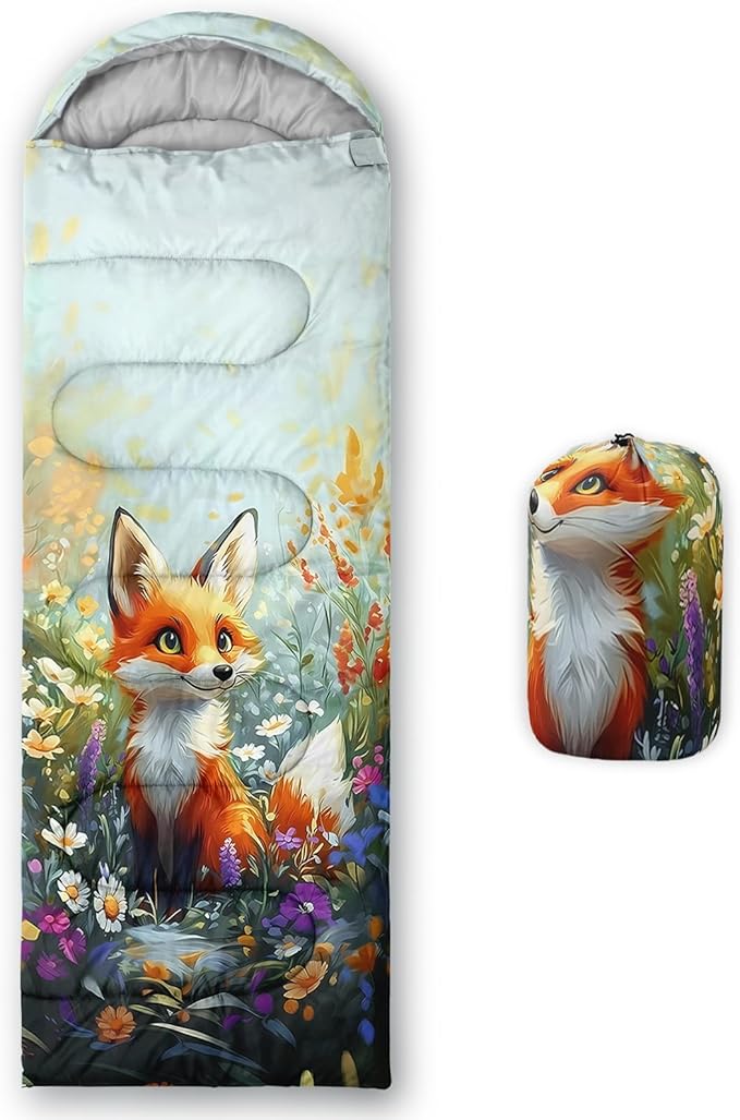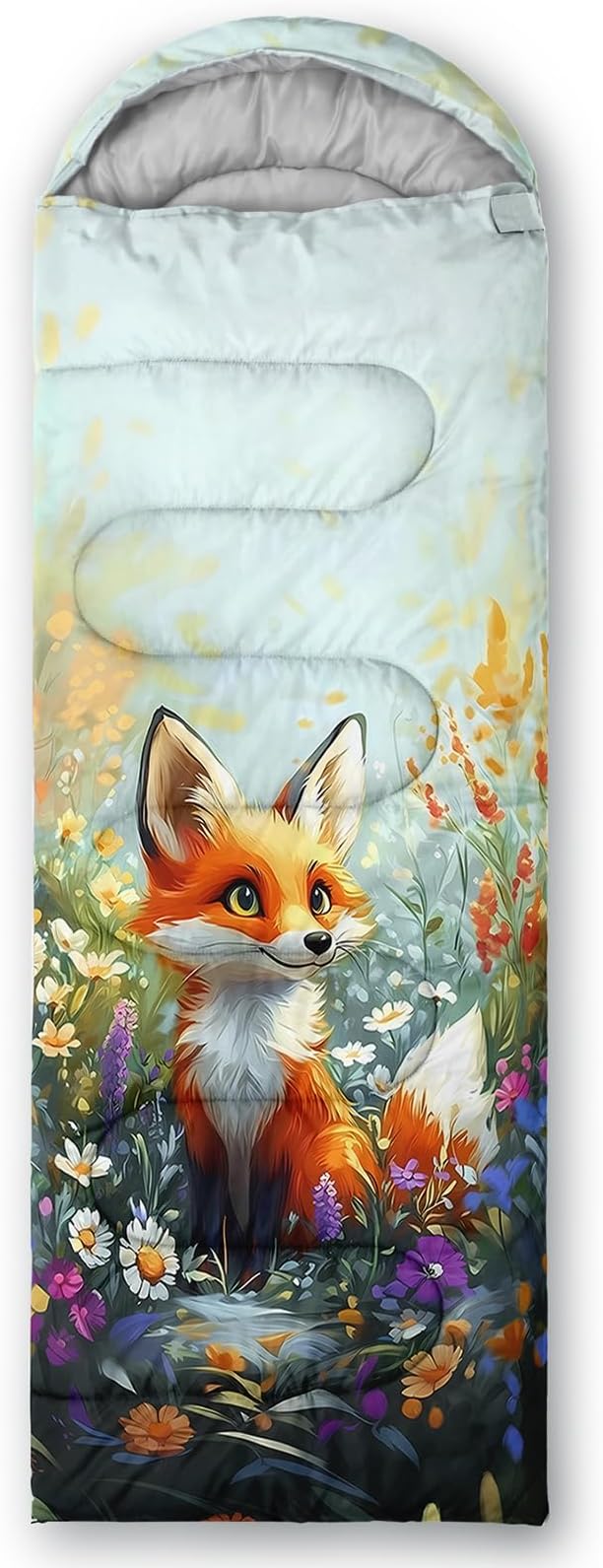 • Unique Fox Design:This Fox pattern sleeping bag is made of 3D digital printing with vibrant colors and patterns,size: 31W x 90L inches,temperature range: 32℉-77℉ (0℃-25℃),it also also have a weather resistant waterproof design to keep you warm and prevent you from any dampness,can be used in 3 seasons