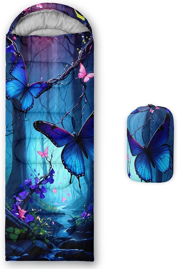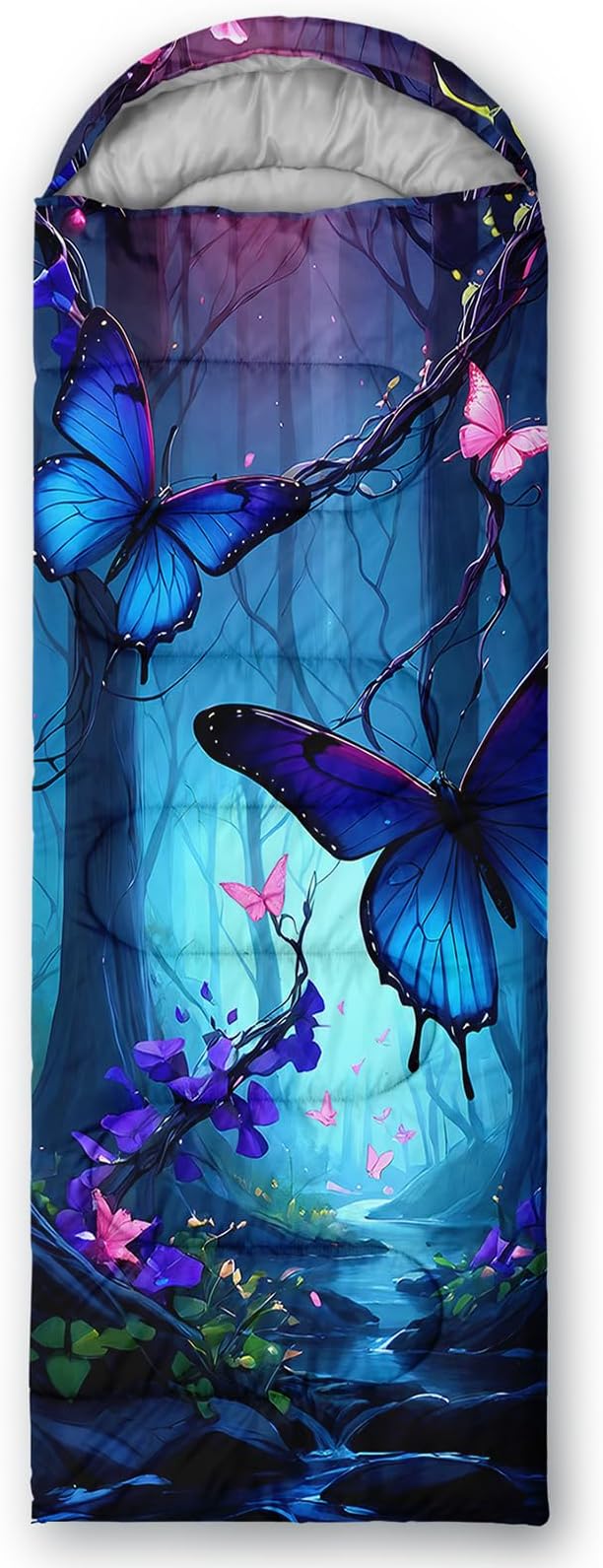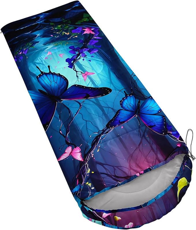 • Unique Butterfly Design:This Butterfly pattern sleeping bag is made of 3D digital printing with vibrant colors and patterns,size: 31W x 90L inches,temperature range: 32℉-77℉ (0℃-25℃),it also also have a weather resistant waterproof design to keep you warm and prevent you from any dampness,can be used in 3 seasons