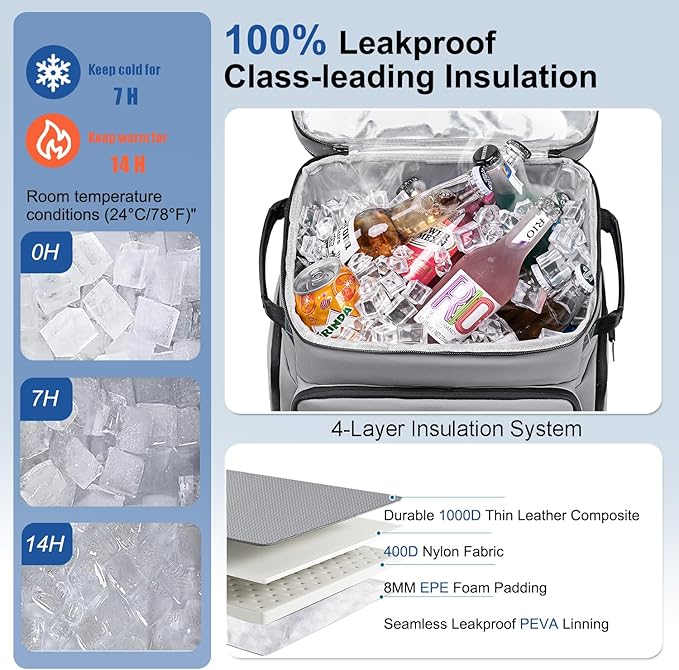 • 【Leakproof & Insulated Backpack Cooler】Backpack cooler Crafted with 8 mm foam insulation padding, Soft cooler backpack maintains food temperatures for up to 16 hours. Backpack ice chest adapt the seamless hot pressing process ensures a leak-proof silver PEVA lining, Further reinforced by smooth horizontal zippers to prevent leaks. Backpack coolers insulated leak proof ideal for beach picnics, hiking, camping, travel, boating, baseball games and work.
