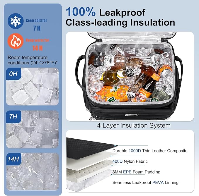 • 【Leakproof & Insulated Backpack Cooler】Backpack cooler Crafted with 8 mm foam insulation padding, Soft cooler backpack maintains food temperatures for up to 16 hours. Backpack ice chest adapt the seamless hot pressing process ensures a leak-proof silver PEVA lining, Further reinforced by smooth horizontal zippers to prevent leaks. Backpack coolers insulated leak proof ideal for beach picnics, hiking, camping, travel, boating, baseball games and work.