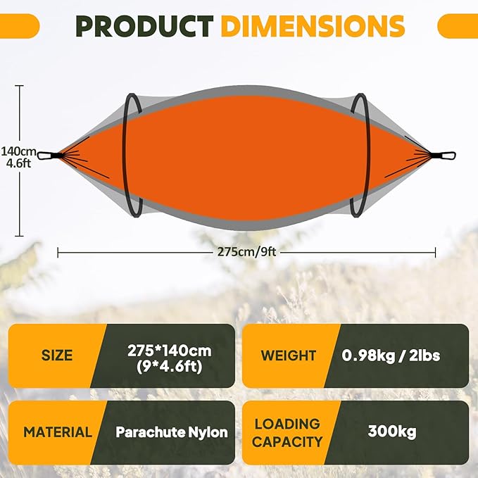 • STRENGTH -We've swapped out the weaker ropes found on most hammocks with our own specially designed ultra-strong non-stretch polyester end straps.It's strong enough to hold over 3 average adults! Unique strap design has breaking strength twice as strong as most competitors.Military-grade 210T parachute nylon fabric makes both a durable and comfortable bed and the unfolding size is:9x4.6 ft.Hammock are tested the capable of holding up to 300+ kg.