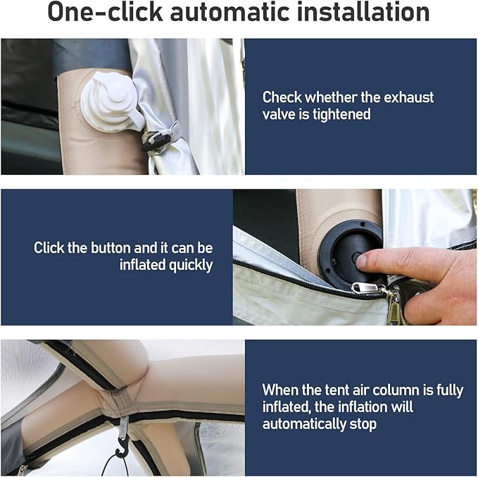 • 【Quick Setup in 2 Minutes】This portable inflatable tent features a one-piece inflatable pole design with high-temperature heat-sealed seams. It features a Built-in air pump that inflates quickly with a pressure-limiting valve for safety. The guylines and steel stakes help secure the 4-season tent to the ground. Set up is fast and easy, making your camping experience more relaxing.