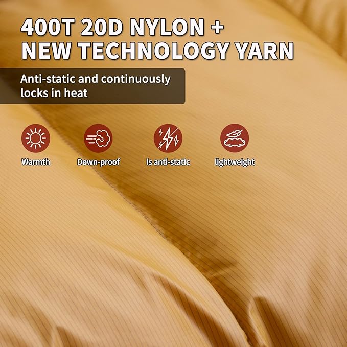 • Special Design: This adult sleeping bag is filled with 3.5 oz (approximately 0.4 in thick) of insulation per 10 square feet, from shoulders to feet. Even when the down loses some of its loft and warmth due to your body weight, it still locks in heat, preventing heat loss from your back and enhancing comfort for extended periods. This makes it ideal for outdoor activities and hiking, ensuring a sound sleep even in the wilderness and rainforest.