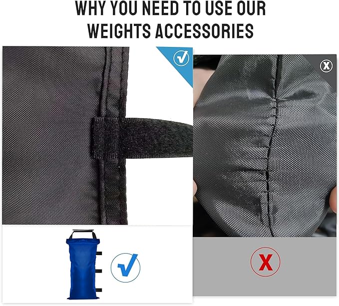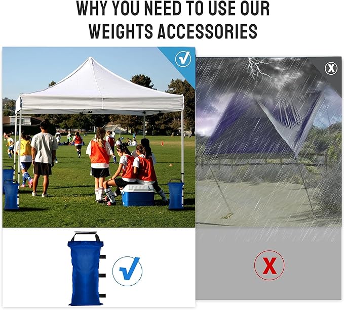 • 【EASY TO FILL & REUSE】 The canopy tent weights feature sturdy built-in handles, making them easy to carry, fill, and install. Simply fill with sand, rocks, gravel and bottled water, then attach to your canopy legs for quick setup and takedown. They can be reused for future events.