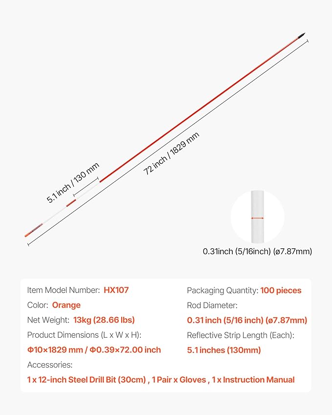 VEVOR Driveway Markers, 100Pcs 72 in Long 5/16 in Dia, Hi-Visibility Driveway Reflectors with 12 in Steel Drill Bits, Reflective Snow Sticks Fiberglass Pole for Parking Lots, Walkways, Snow Plowing