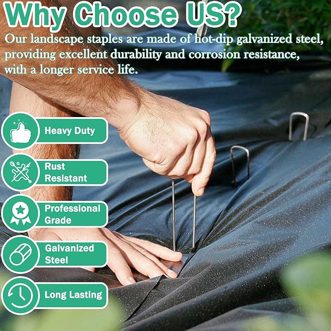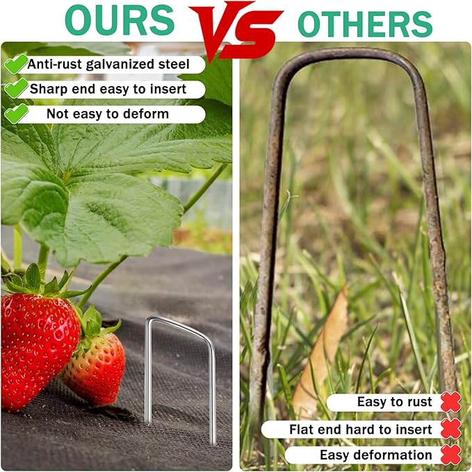 • 【Easy to Use】The sharp end allows yard stakes to easily and quickly penetrate weed barrier fabric, sod, plastic sheeting, heavy soil, and mats. The landscape fabric pins can be inserted into the soil by hand, hammer, etc.