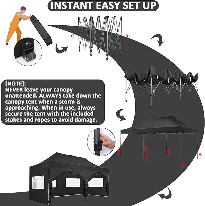 • 【6 Removable Sidewalls】The 6 side walls with PU coating are connected to the top of the frame and the legs by a whole piece of touch fastener for fixing, and are detachable, you 10 x 20 canopy tent heavy duty can install any number of side walls, which is convenient and practical. When in use, always secure the 10x20 pop up tent with the included stakes and ropes to avoid damage. One year after-sale protection for canopy frame; Six months after-sale protection for fabrics and accessories.