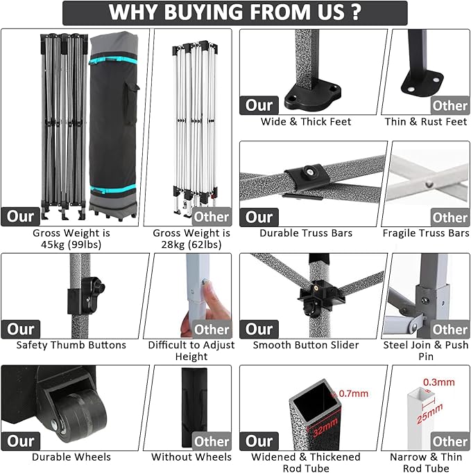 • 【3 Height Settings】10x20 pop up party tent straight leg has 3 height settings. Thumb latch lock system easy to lock and release, raise the pop up tent to a desired height. Canopy tent 10x20 straight leg height options: 220cm/86.6inch, 230cm/90.6inch, 240cm/94.5inch. Corresponding party tent center height options: 310cm/122.0inch, 320cm/126.0inch, 330cm/129.9inch. 10x20 canopy with sidewalls perfect for commercial activities, camping, festivals, tailgating, backyard events and etc..