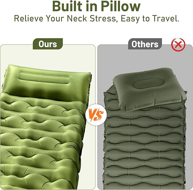• 【Silent Comfort】Made with 200T pongee for a smooth, quiet feel, plus TPU lining for enhanced durability. This sleeping mat won’t squeak like nylon when you turn and twist. Built for peaceful sleep-Ideal for camping, car trips, or backpacking, where restful sleep matters most.