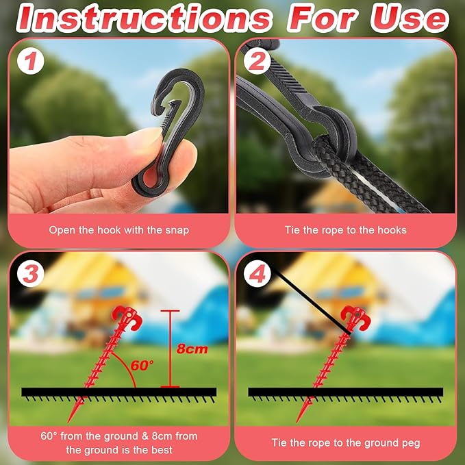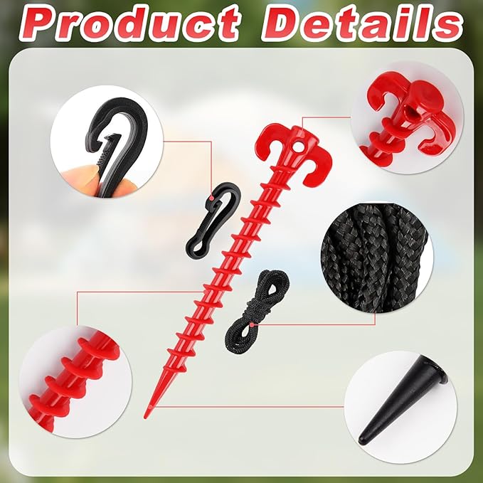 • AMPLE QUANTITY: You will receive 16 red tent stakes, 16 nylon ropes, and 16 plastic hooks, for a total of 48 pieces, enough to meet all your needs
