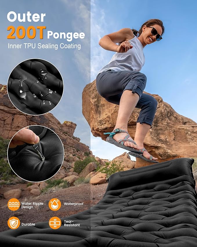 • 【Outdoor Grade Comfortable & Durable Material】Constructed with high-quality 200T pongee fabric and a TPU sealed coating, this camping mattress pad is tear-resistant, low-noise, waterproof, and easy to clean. It withstands objects like keys and branches, making it ideal for various terrains such as grass, rocks, and deserts. Its excellent waterproofing means a quick towel wipe even in rain. It offers comfort and relaxation for easy outdoor rest.