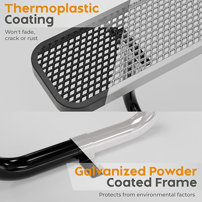 • Designed for Decades of Outdoor Use: Rectangular outdoor picnic table crafted from industrial-strength steel and thick coated in thermoplastic for rust-free, long-lasting quality. Sturdy steel frame with powder-coat finish resists harsh weather, making it the definition of a weather proof table.