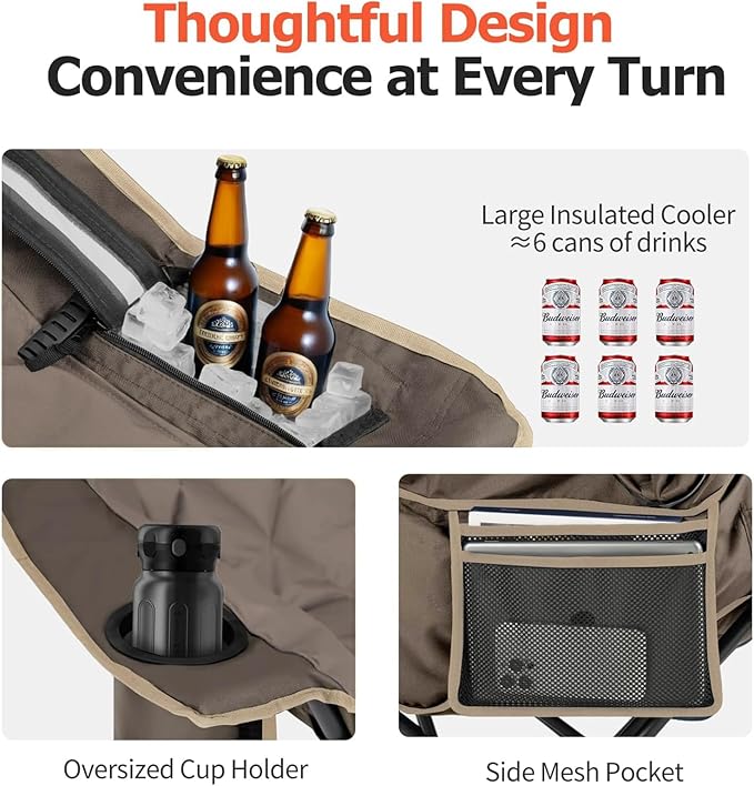 • Thoughtful Features for Convenience: Designed with the user in mind, Overmont camping chair includes an oversized cup holder that fits most beverage sizes and a large cooler bag for your favorite drinks. The side mesh pocket provides easy access to personal items, making it a versatile choice for comfy camping chairs for adults.