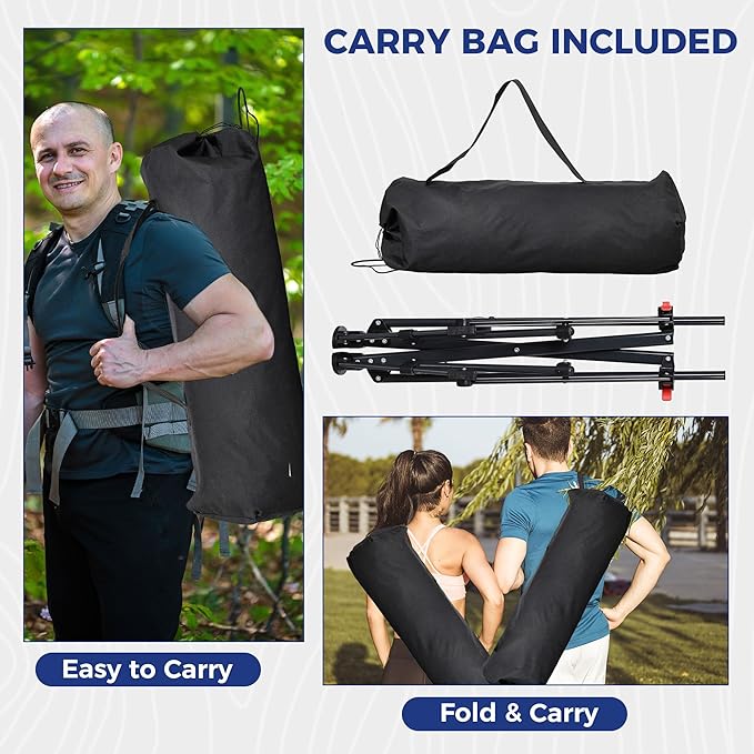 • Easy to Assemble: With a portable bag, it is easy to move from one location to another and simple to set up. You can simply extend the frame and slide the locking mechanism down to secure it in place, and then hang the cushion on. Please lock the chair before using it (Make sure the red buckle is under the protruding iron block).