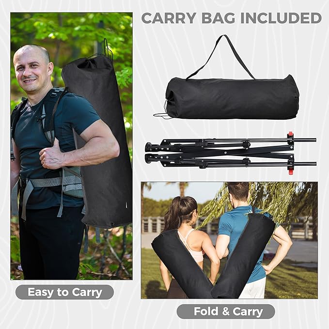 • Easy to Assemble: With a portable bag, it is easy to move from one location to another and simple to set up. You can simply extend the frame and slide the locking mechanism down to secure it in place, and then hang the cushion on. Please lock the chair before using it (Make sure the red buckle is under the protruding iron block).