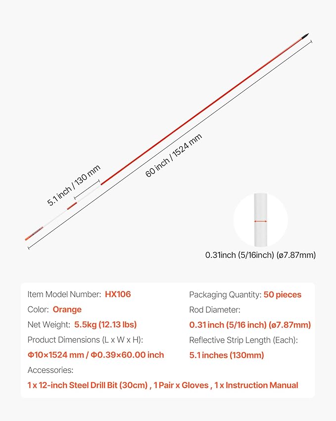 VEVOR Driveway Markers, 50Pcs 60 in Long 5/16 in Dia, Hi-Visibility Driveway Reflectors with 12 in Steel Drill Bits, Reflective Snow Sticks Fiberglass Pole for Parking Lots, Walkways, Snow Plowing