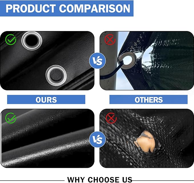 • Heavy-Duty and Sturdy: With sturdy grommets and reinforced edges on our waterproof tarps heavy duty outdoor, the tarps heavy duty waterproof has rust-proof aluminum grommets every 3 feet to make it easy to secure and tie down. This design enables roof tarps for camping to fit tightly and firmly to objects, effectively preventing wind and rain from penetrating, and providing better use results