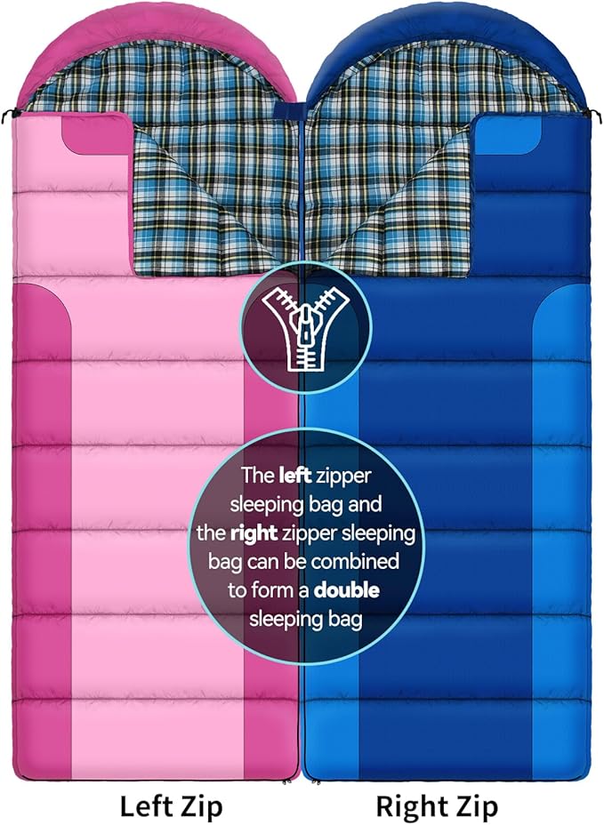 • CAMPING SLEEPING BAG DESIGN : Separate zipper at the foot to allow more warm or cool air to enter or exit the bag in different times of the season. There are two zippers on the side, which can make two sleeping bags of a specific color spliced together to become a large double sleeping bag for couples, sisters.