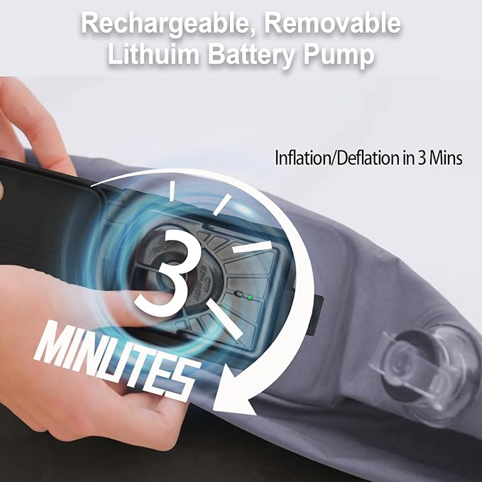 • 3-Minute Fast Inflation with Dual-Power Option:Features a built-in 1300mAh lithium battery pump (USB-C rechargeable) for cordless inflation in just 3 minutes, plus an included power cord for outlet use. The LED display clearly shows the power mode.A single charge supports multiple full inflations and deflations, making it perfect for outdoor adventures or quick indoor setup.