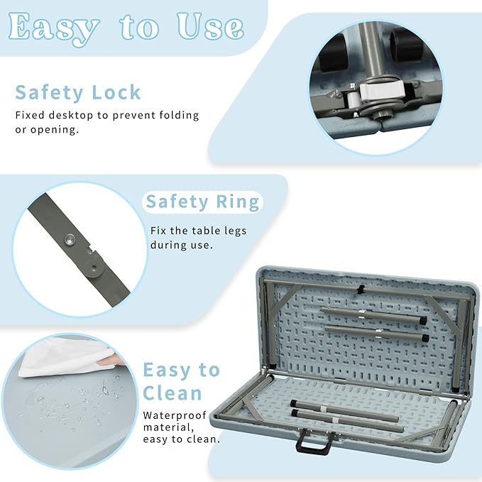 • Easy to Use: This picnic table can be used directly without assembly, simply open or fold the table legs to easily complete the installation or folding of the table. The built-in safety lock of the folding table can secure the table from folding or opening.