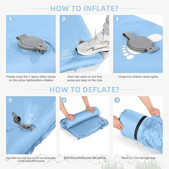 • Upgraded Valves For Easier Storage: Storage of foam sleeping mats has always been a challenge, and to make it easier, we have revolutionized the valve making it a dual-use valve. When inflating, simply open the two layers for self-inflating. When you need to deflate, OPEN ONLY THE FIRST LAYER and be sure to keep the second layer closed, in this state, air can only go out and not in, then you just need to squeeze out the air to complete the storage.