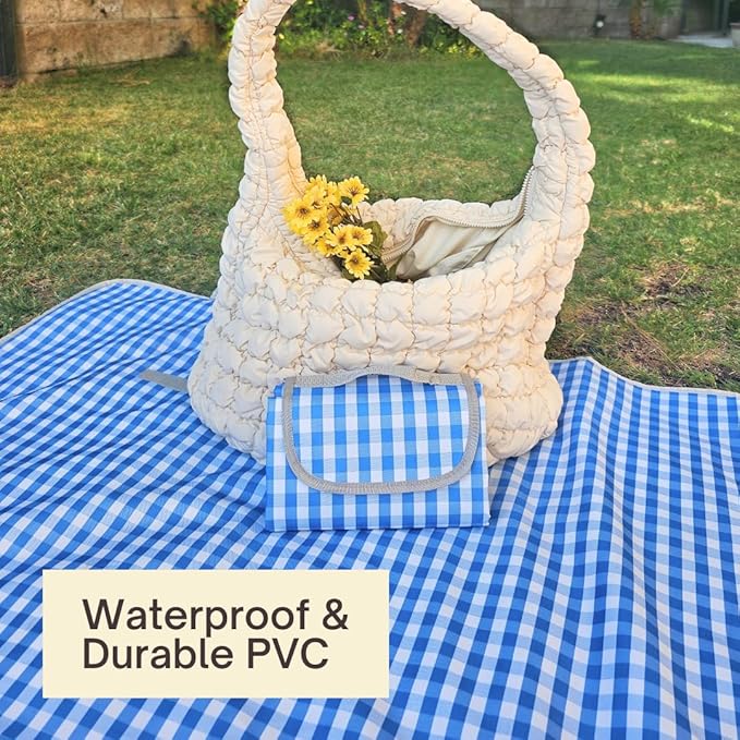 Cute Gingham Picnic Blanket, Waterproof Foldable, in Large 80x60in and Extra Large 80x80in, Portable Compact Beach Blanket, Oversized XL Outdoor Mat (Blue, X-Large)