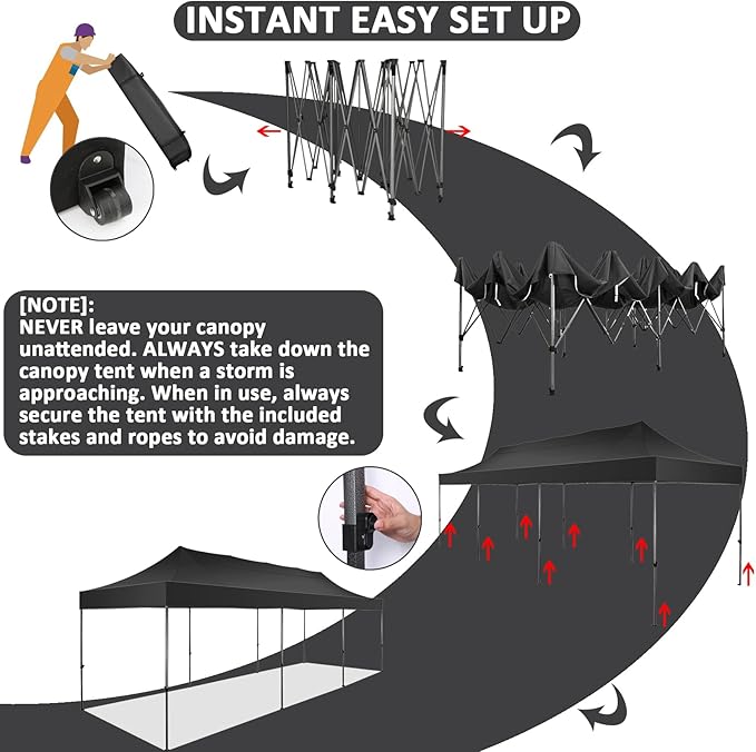• 【300 SQ Feet Shade Area】COBIZI 10x30 pop up tent provides 300 SQFT spacious covered space, it can easily accommodate 15-20 people, meet your different needs for holding large gatherings. Perfect for wedding, birthday party, market event and other larger events. When in use, always secure the 10x30 pop up tent with the included stakes and ropes to avoid damage. One year after-sale protection for canopy frame; Six months after-sale protection for fabrics and accessories.