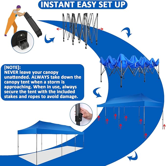 • 【300 SQ Feet Shade Area】COBIZI 10x30 pop up tent provides 300 SQFT spacious covered space, it can easily accommodate 15-20 people, meet your different needs for holding large gatherings. Perfect for wedding, birthday party, market event and other larger events. When in use, always secure the 10x30 pop up tent with the included stakes and ropes to avoid damage. One year after-sale protection for canopy frame; Six months after-sale protection for fabrics and accessories.
