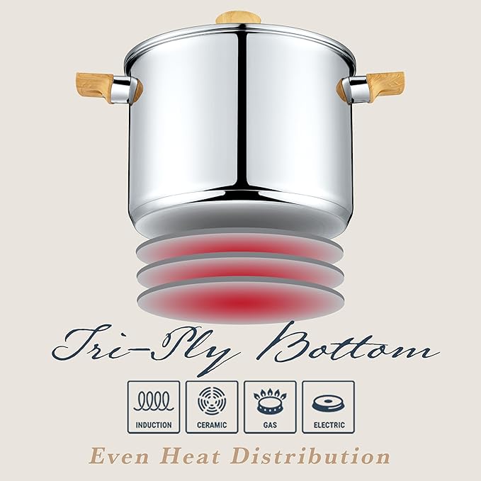 • Full stainless steel body with stay cool faux wood handle and a triply bottom for even heat distribution