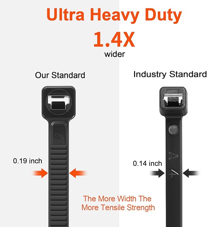 • 【100lb Tensile Strength】: The more width and Thickness, the more tensile strength. our zip ties 14 inch width is 0.19 inch(4.8mm), while industry standard is 0.14 inch(3.6mm), our zip ties 14 inch Thickness is 0.065" inch(1.65 mm), while industry standard is 0.05 inch(1.25mm),more tensile strength.