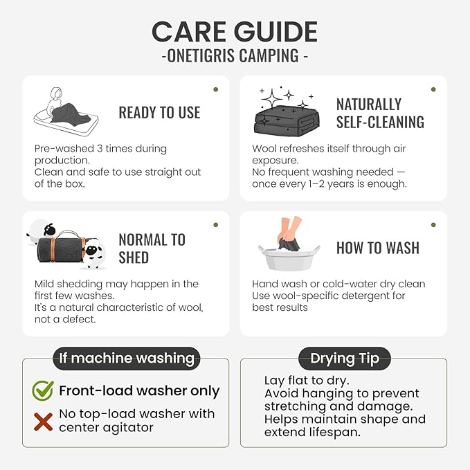 • Natural Wool, Warm and Reliable:Wool is a trusted natural fabric with inherent temperature-regulating properties, renowned for its warmth and breathability, naturally balancing your body temperature whether wet or dry.The OneTigris wool blanket is made with an ideal blend of 80% premium natural wool and 20% hypoallergenic synthetic fiber, retaining the comfort and warmth of wool while enhancing durability and wash resistance—for years of dependable use