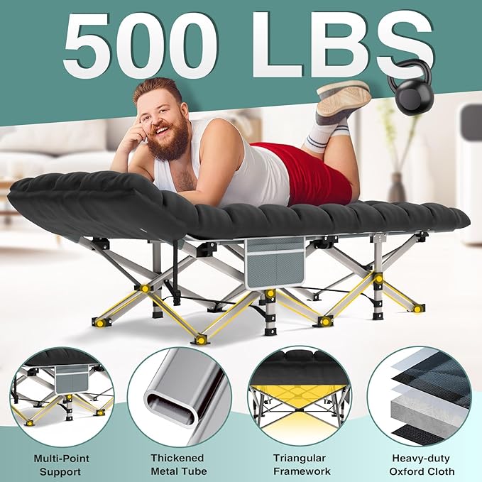 • Superior Stability & 500 LBS Capacity: Rest confidently on a camping cot designed for exceptional support. Featuring 10 enhanced 25mm thick flat round square iron legs, it ensures uniform weight distribution and supports up to 500 lbs. Non-slip plastic nubs keep the cot secure on any terrain, providing a safe, worry-free slumber under the stars.