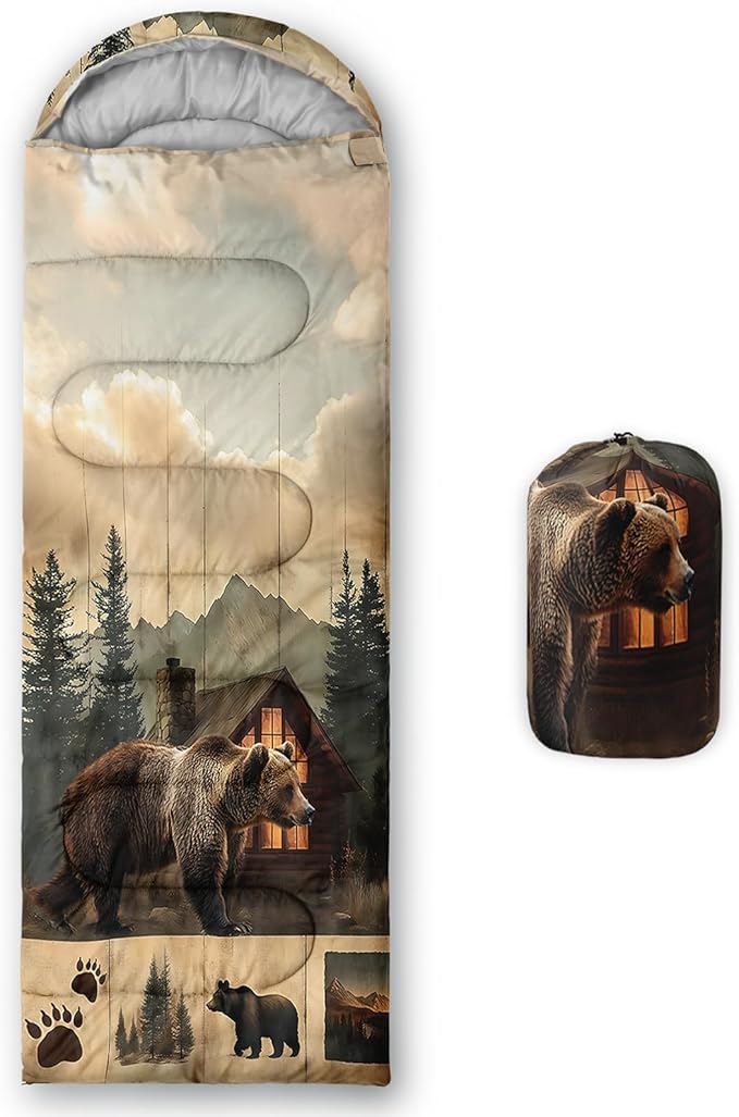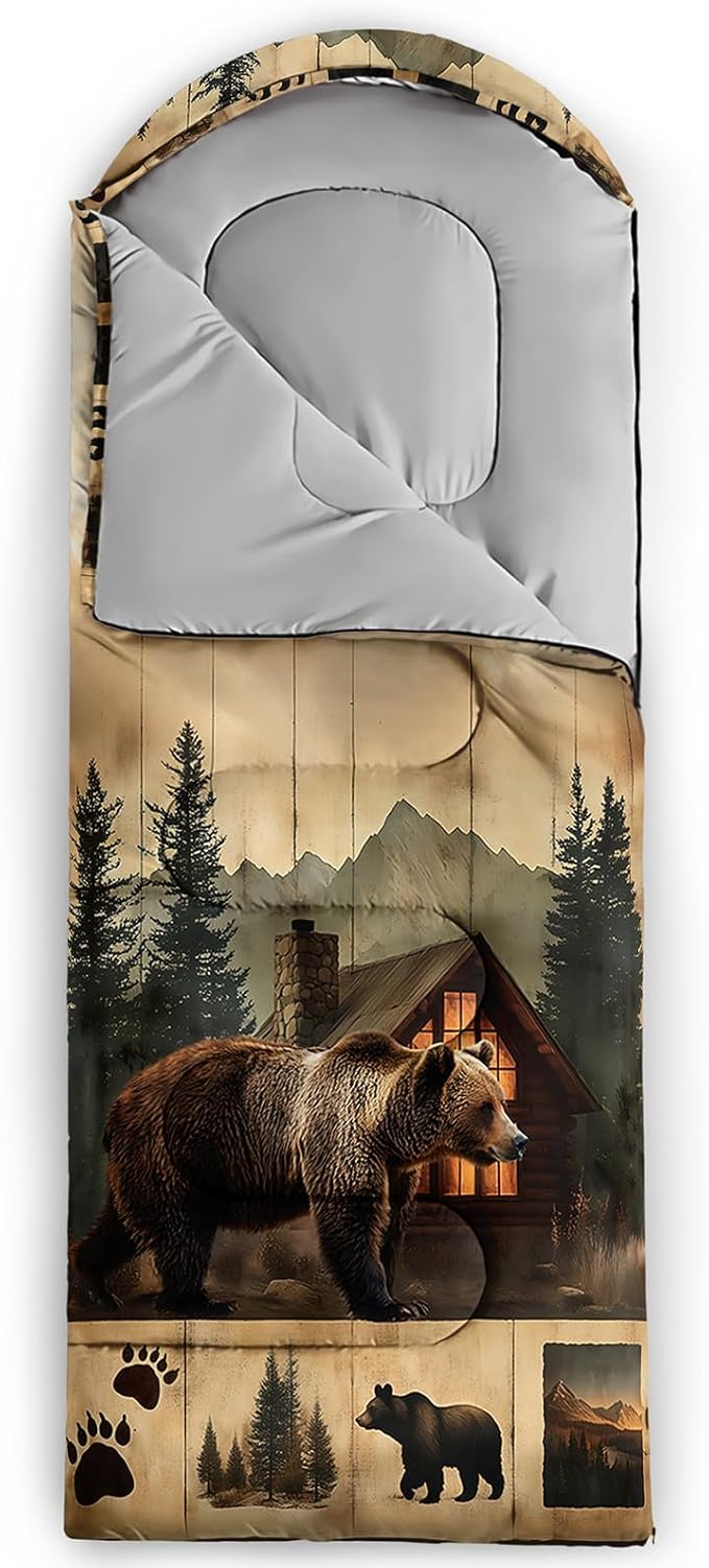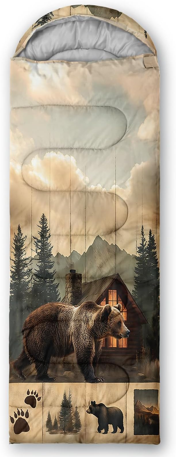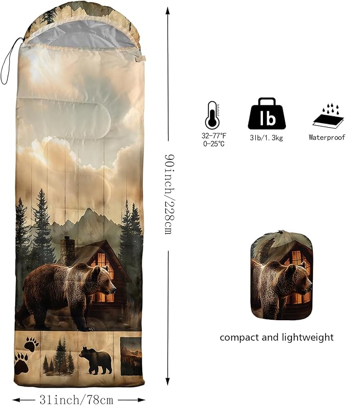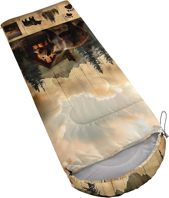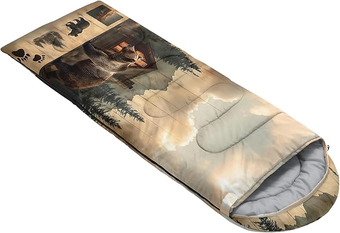 • Unique Bear Design:This Bear pattern sleeping bag is made of 3D digital printing with vibrant colors and patterns,size: 31W x 90L inches,temperature range: 32℉-77℉ (0℃-25℃),it also also have a weather resistant waterproof design to keep you warm and prevent you from any dampness,can be used in 3 seasons
