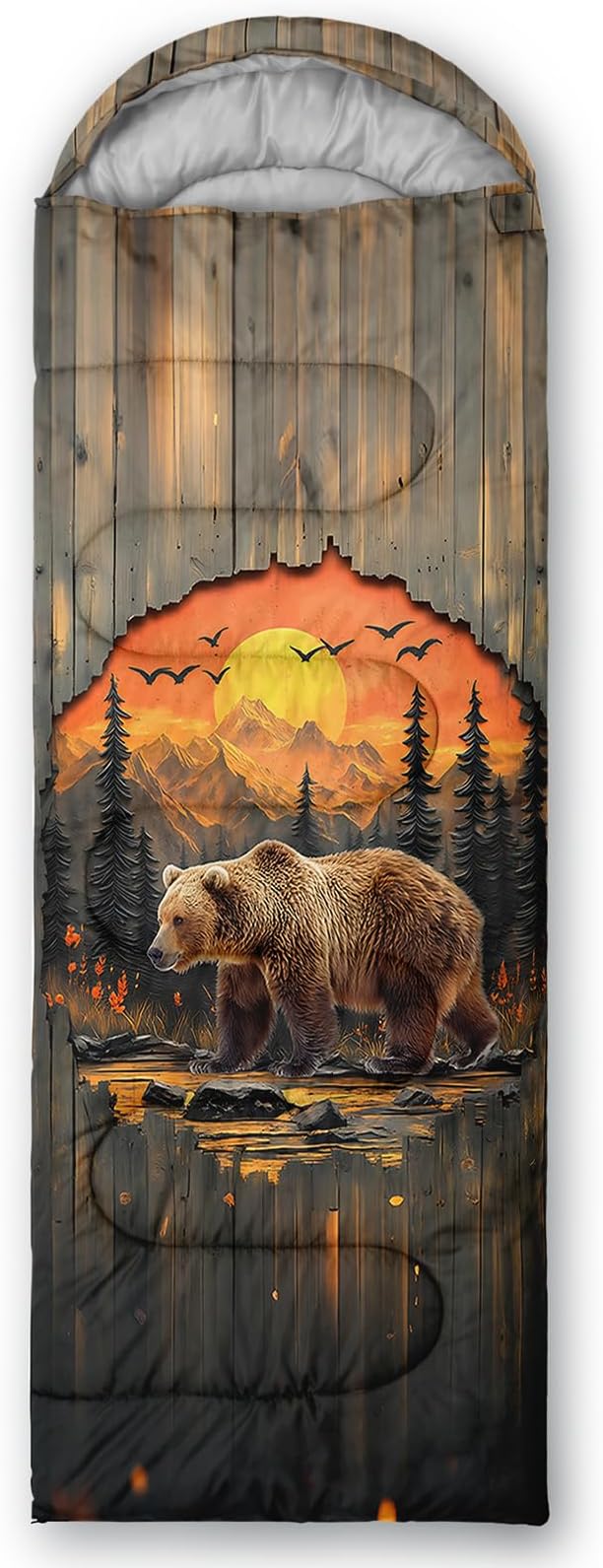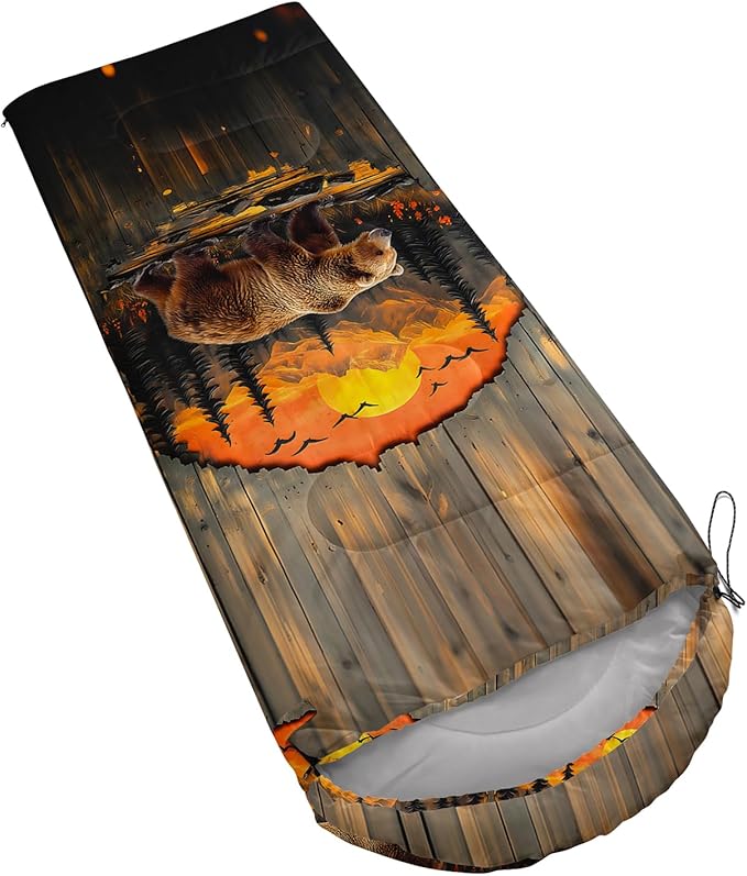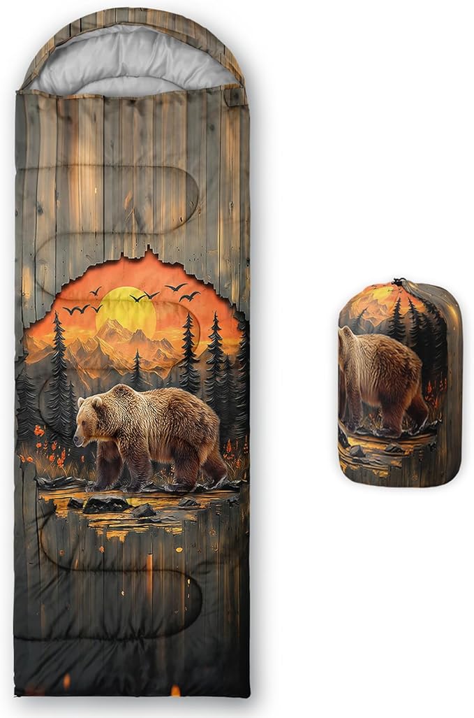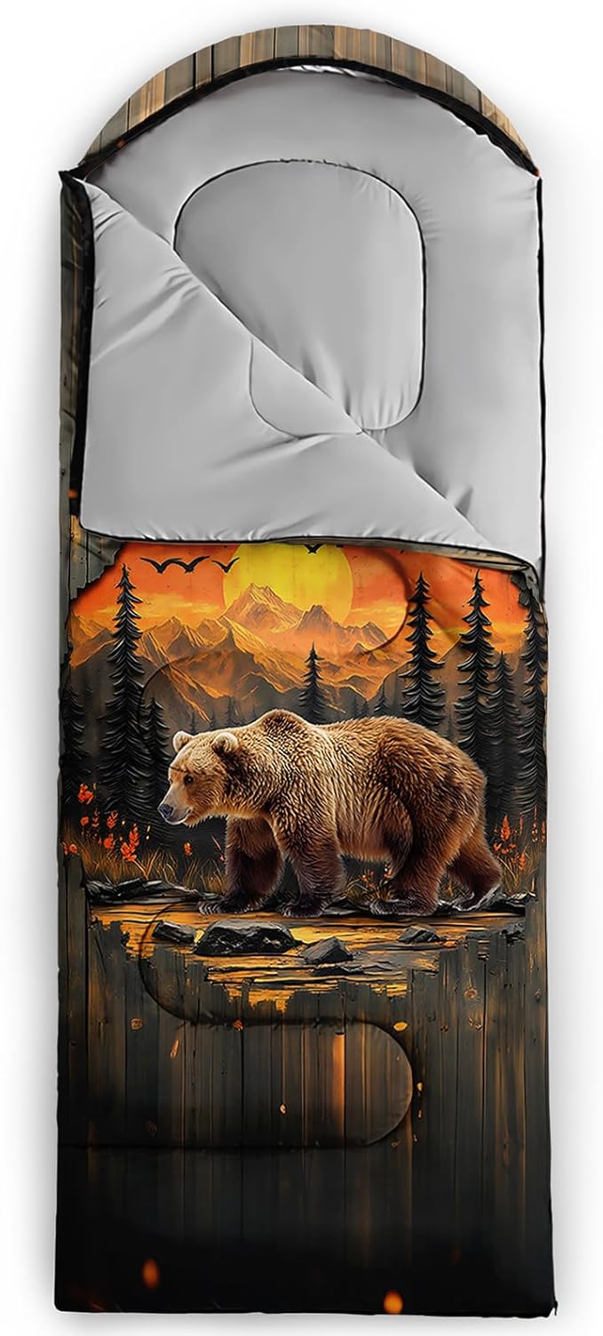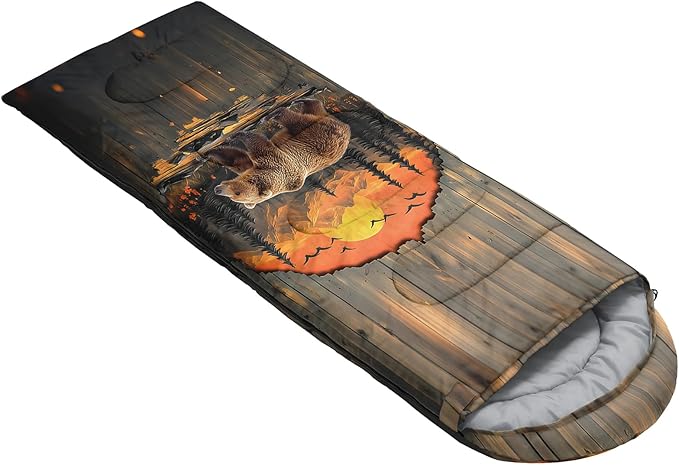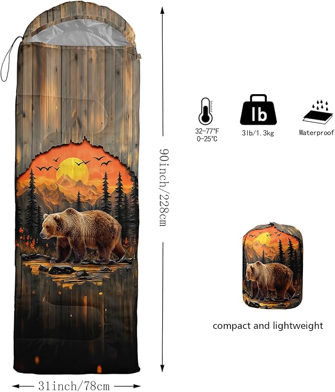 • Unique Bear Design:This Bear pattern sleeping bag is made of 3D digital printing with vibrant colors and patterns,size: 31W x 90L inches,temperature range: 32℉-77℉ (0℃-25℃),it also also have a weather resistant waterproof design to keep you warm and prevent you from any dampness,can be used in 3 seasons