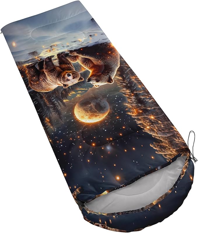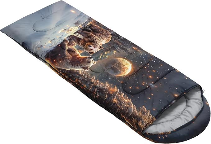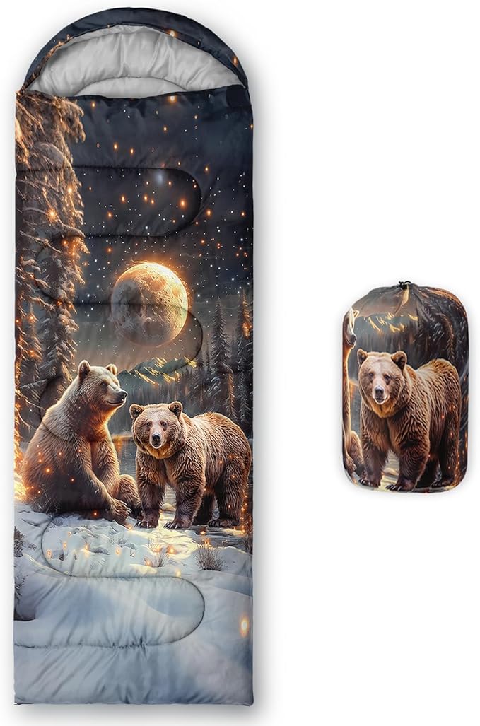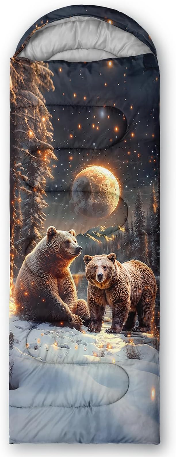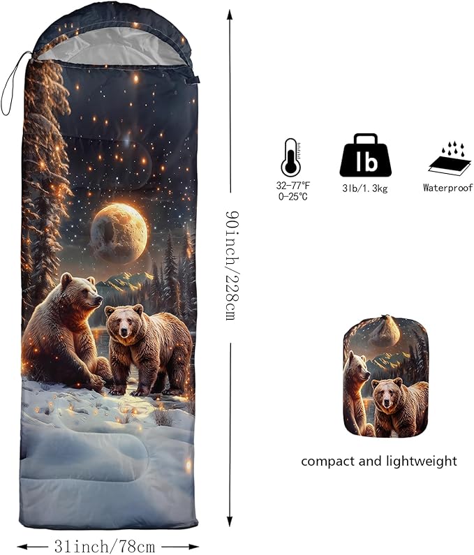 • Unique Bear Design:This Bear pattern sleeping bag is made of 3D digital printing with vibrant colors and patterns,size: 31W x 90L inches,temperature range: 32℉-77℉ (0℃-25℃),it also also have a weather resistant waterproof design to keep you warm and prevent you from any dampness,can be used in 3 seasons