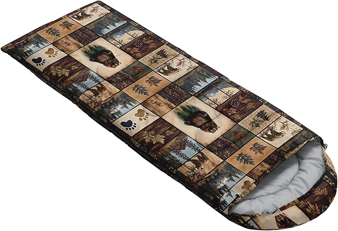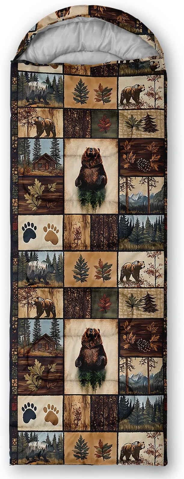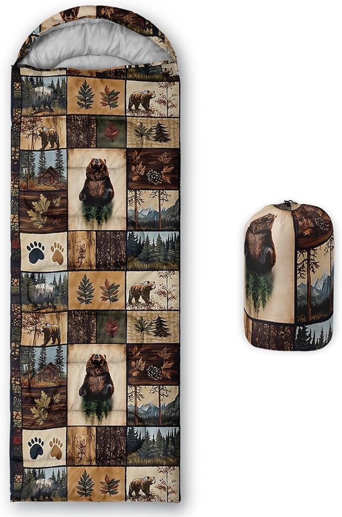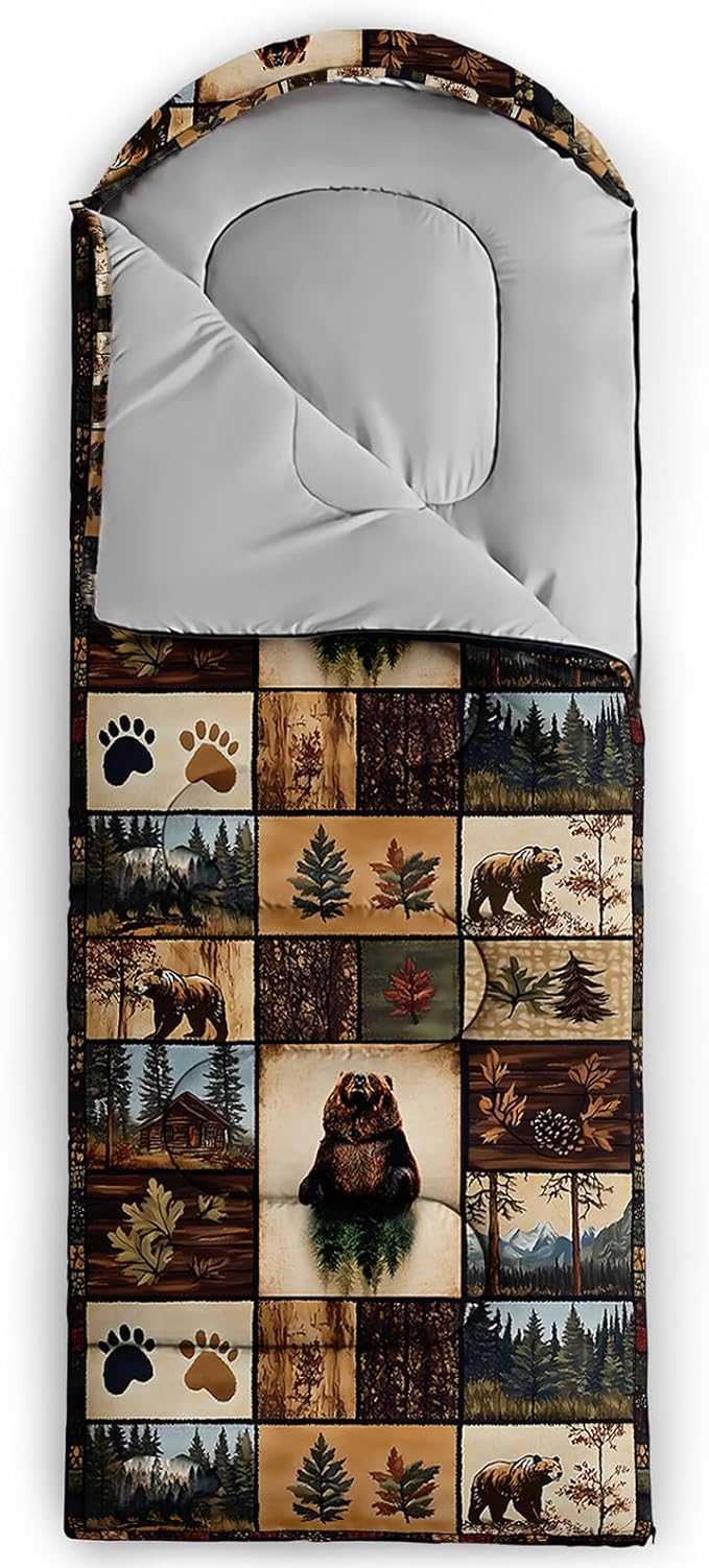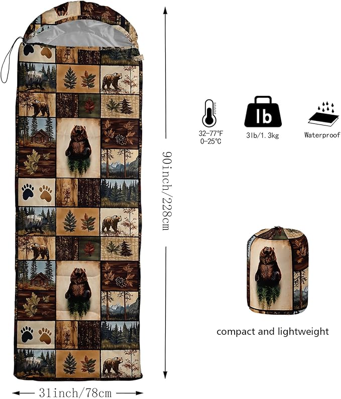• Unique Bear Design:This Bear pattern sleeping bag is made of 3D digital printing with vibrant colors and patterns,size: 31W x 90L inches,temperature range: 32℉-77℉ (0℃-25℃),it also also have a weather resistant waterproof design to keep you warm and prevent you from any dampness,can be used in 3 seasons