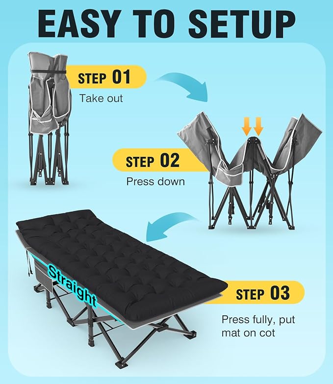 • 【Portable & Folding】Weighing only 23.3 lbs, this cot folds down to 45.3" x 10.2" x 7" and includes a carrying bag for easy transport. Set up or pack away in seconds—ideal for road trips, festivals, or small tents. No more bulky, hard-to-store gear!