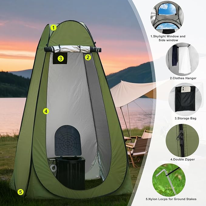 • Instant Privacy & Protection On-The-Go: The included pop-up privacy tent offers essential seclusion in seconds. This Camp Shower Tent Durable, water-resistant fabric and Two windows can provide ventilation and prevent stuffiness. Perfect for sensitive needs and changing clothes.